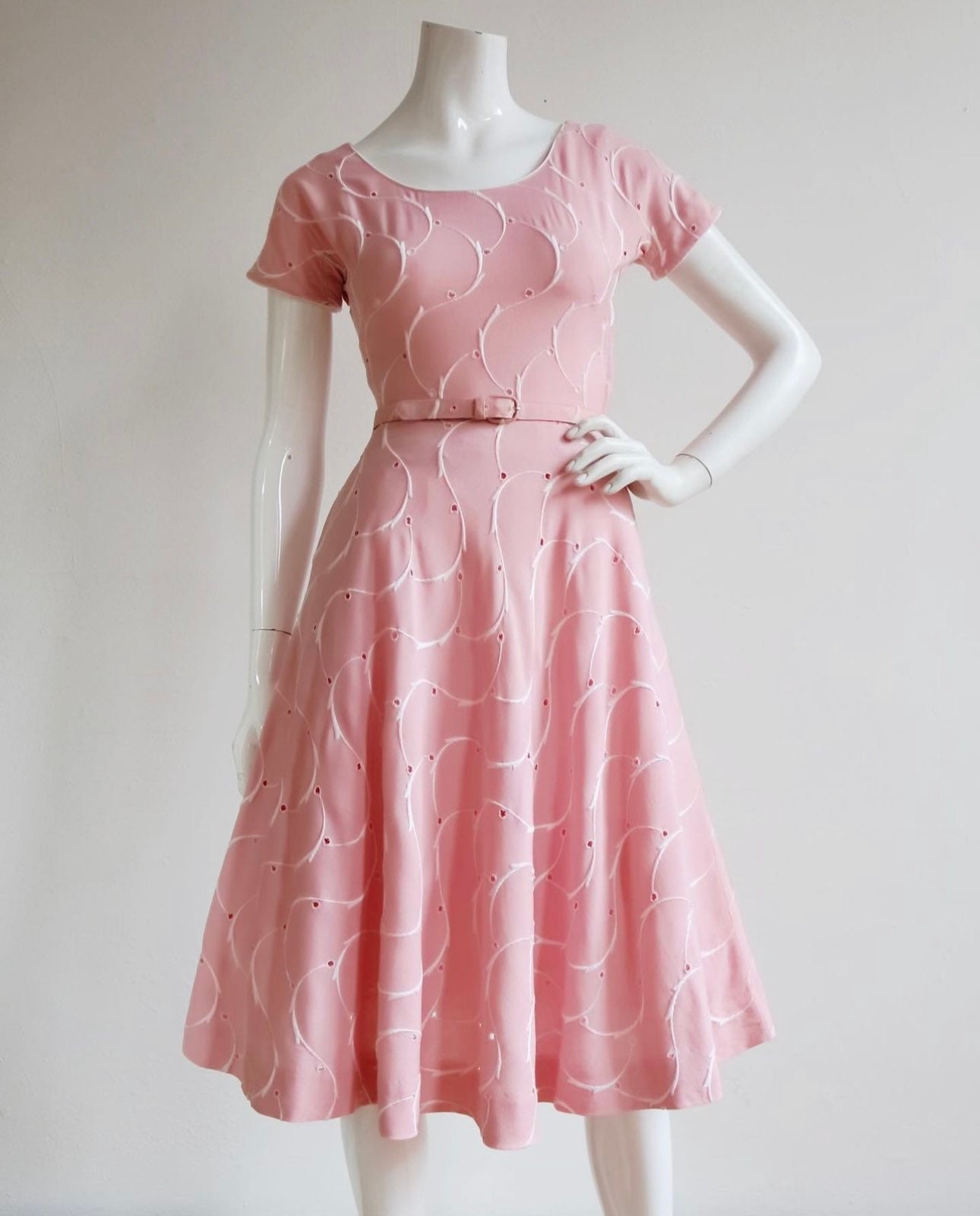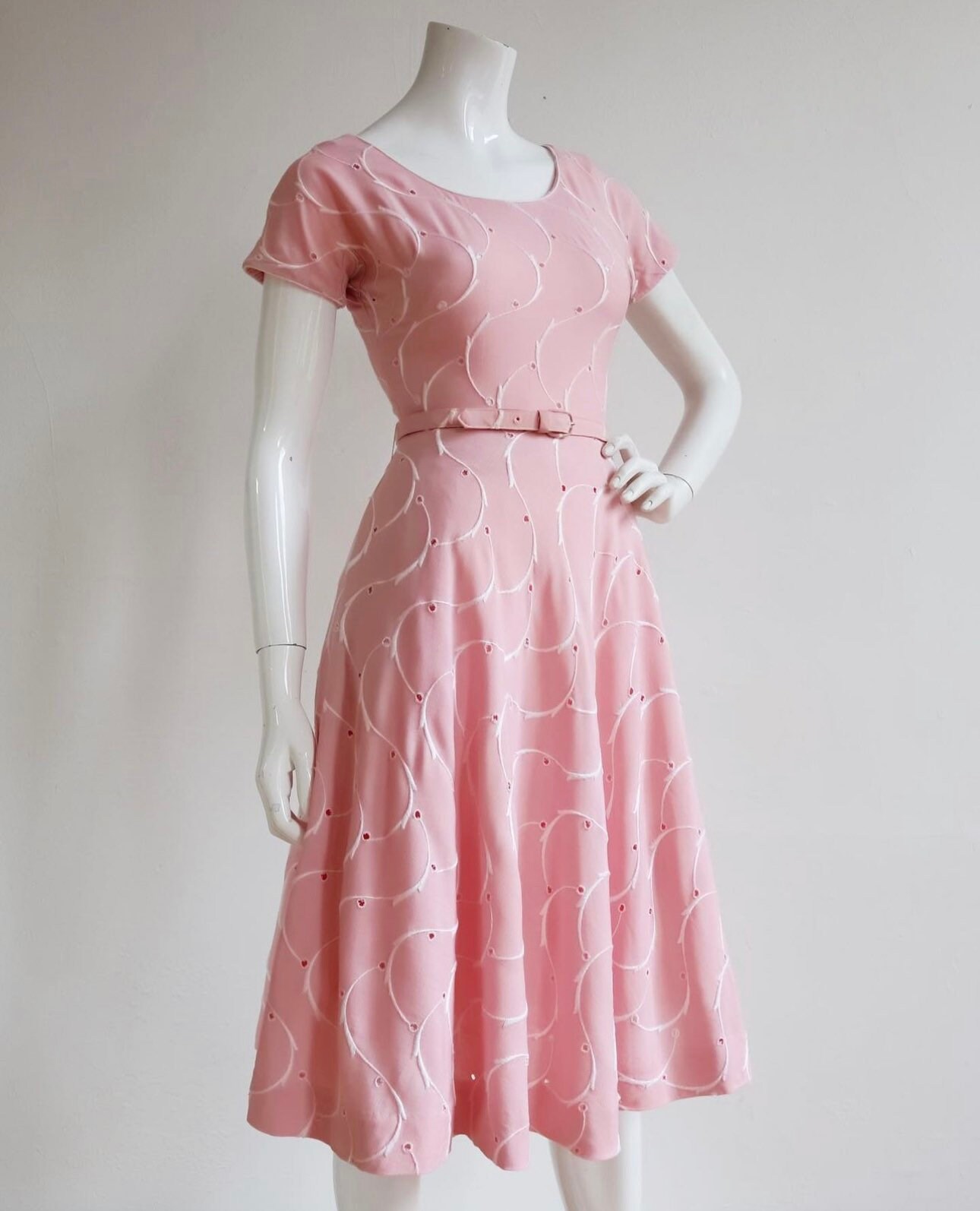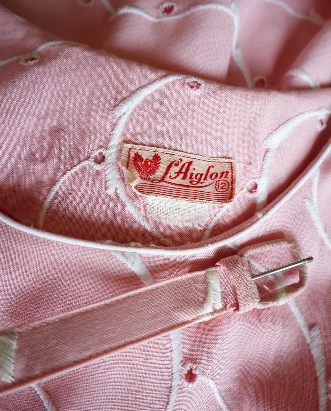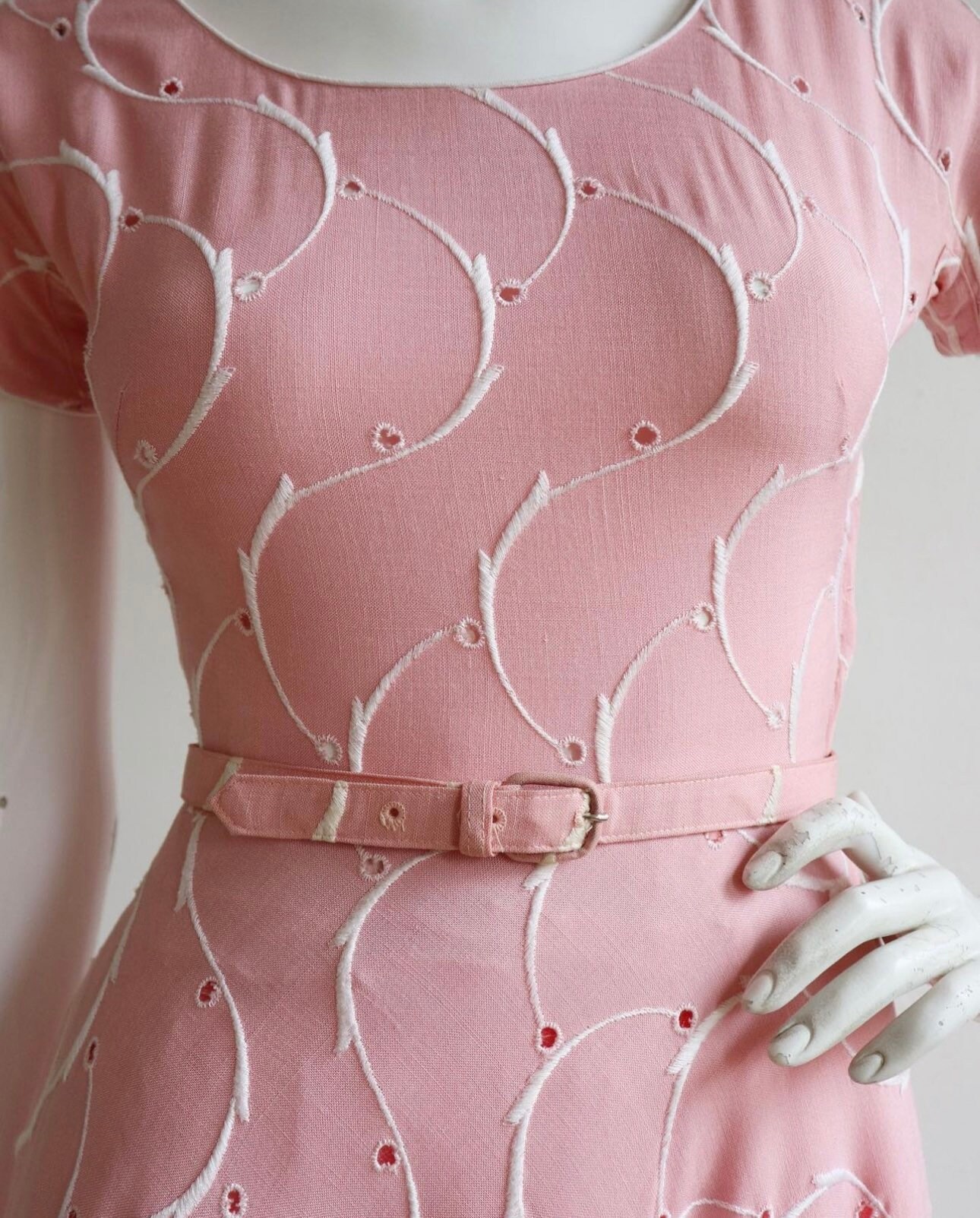 Simply sweet, this 1940’s soft pink cotton/linen dress by L’Aiglon features broad wisps with Broderie anglaise, rounded neckline, fitted waist and a flirty full skirt with single hip pocket.