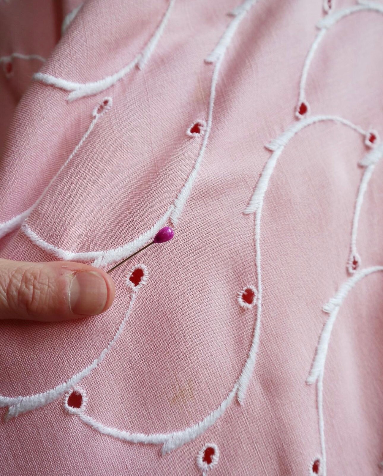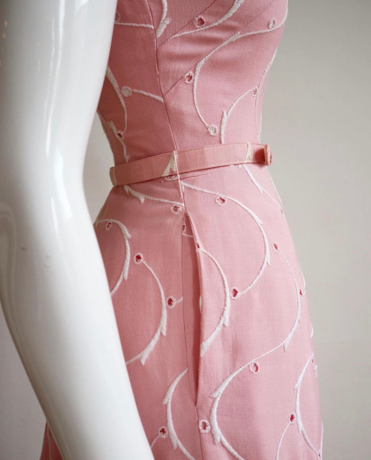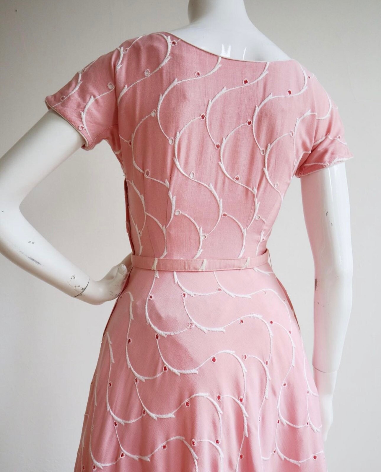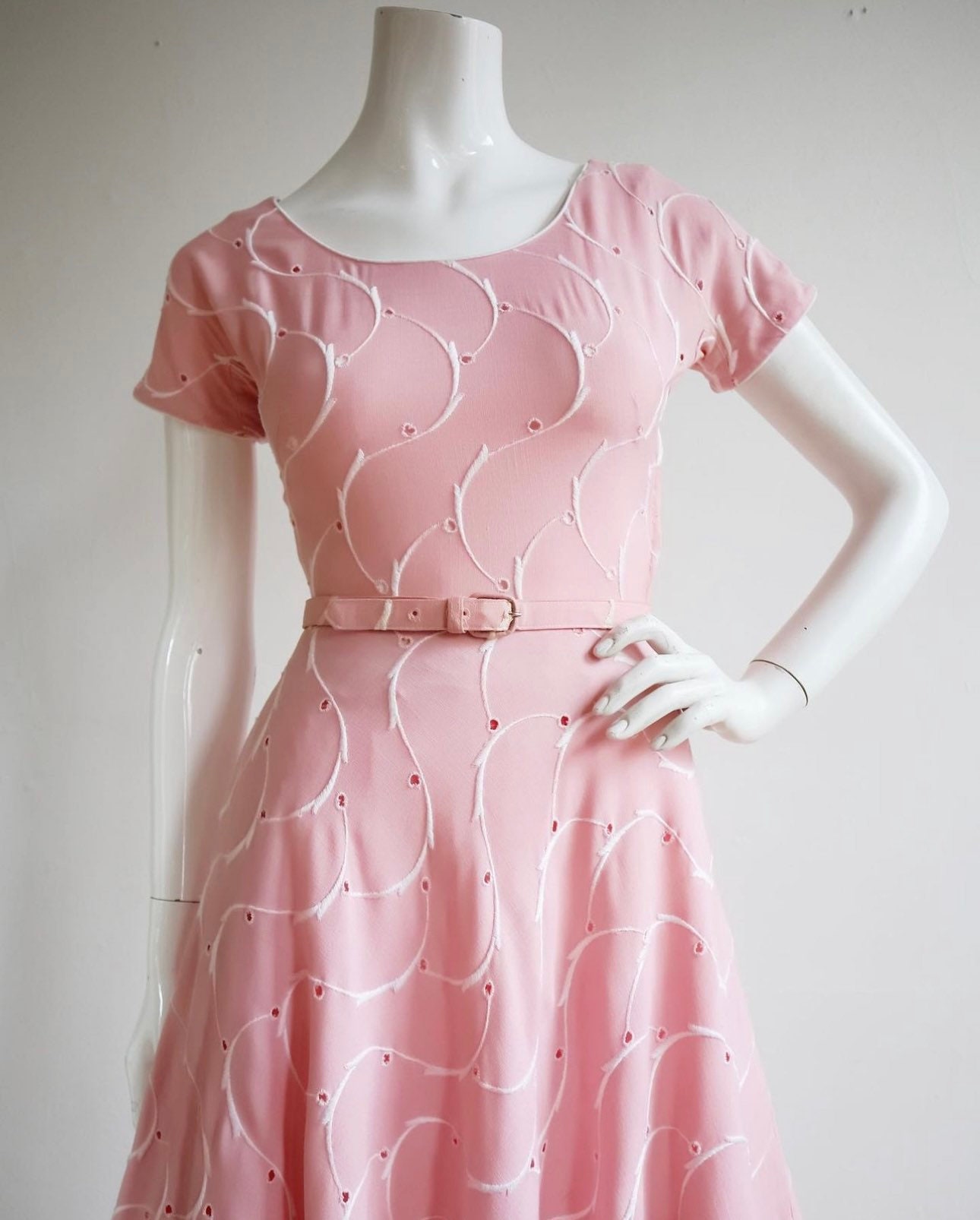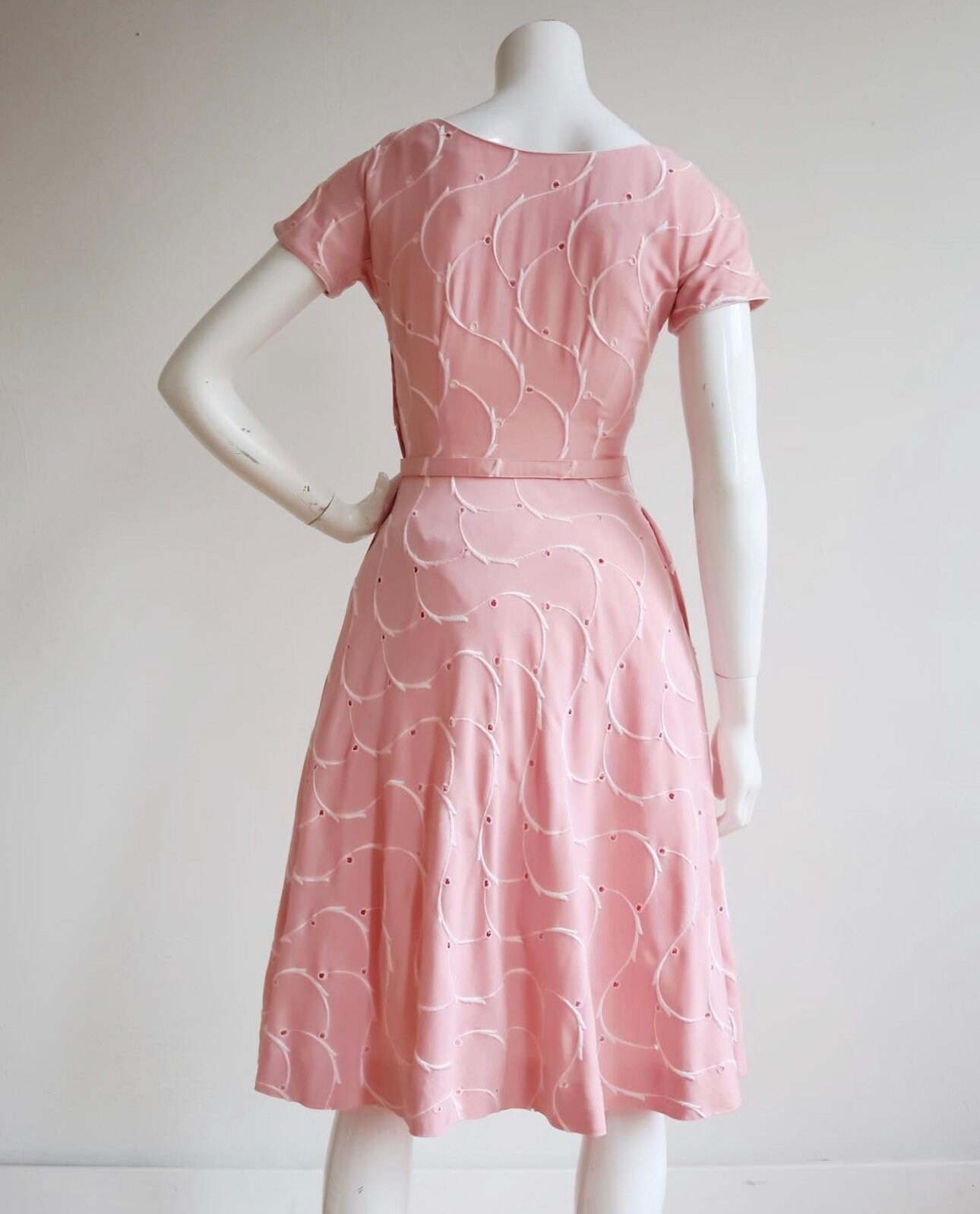 Simply sweet, this 1940’s soft pink cotton/linen dress by L’Aiglon features broad wisps with Broderie anglaise, rounded neckline, fitted waist and a flirty full skirt with single hip pocket.