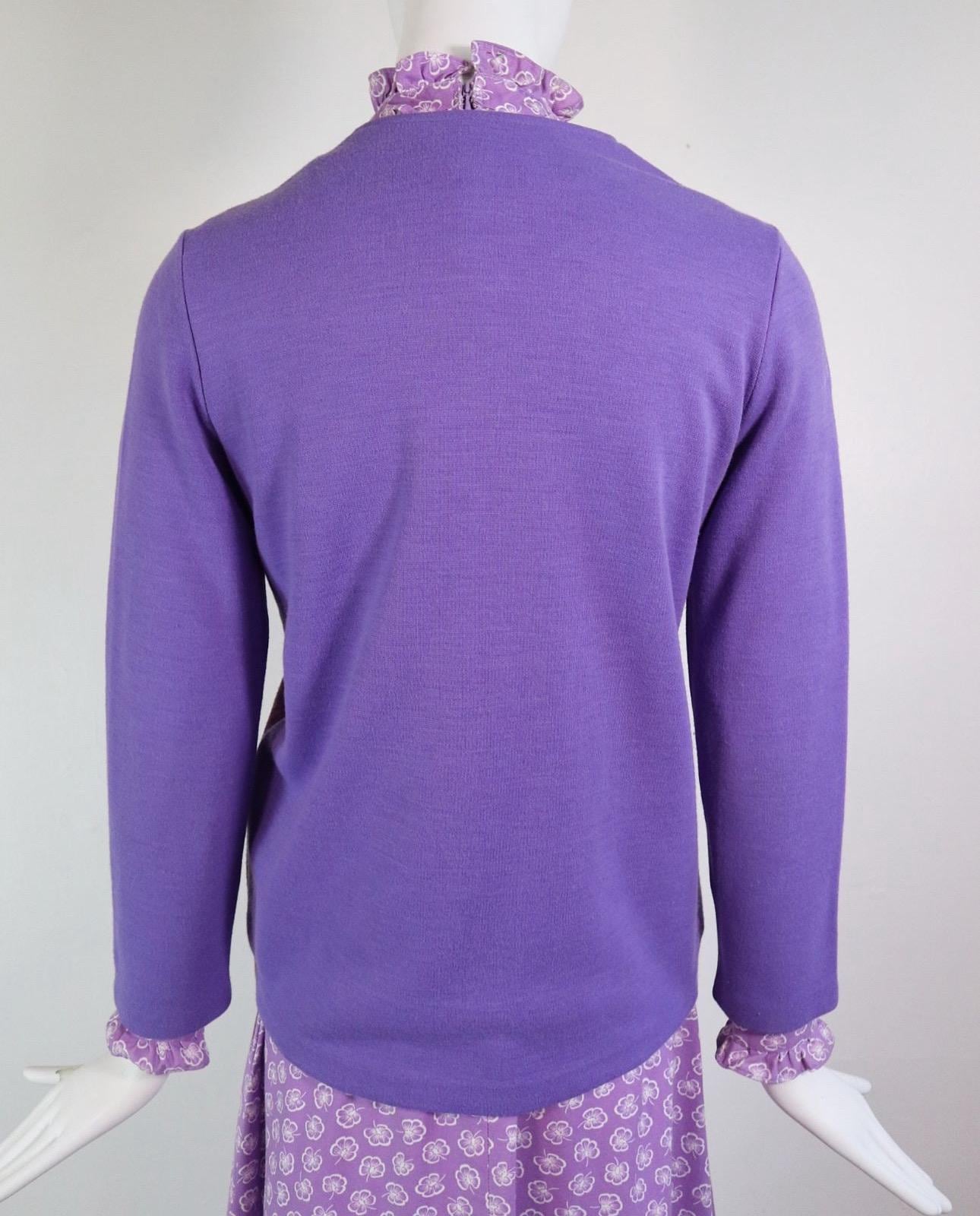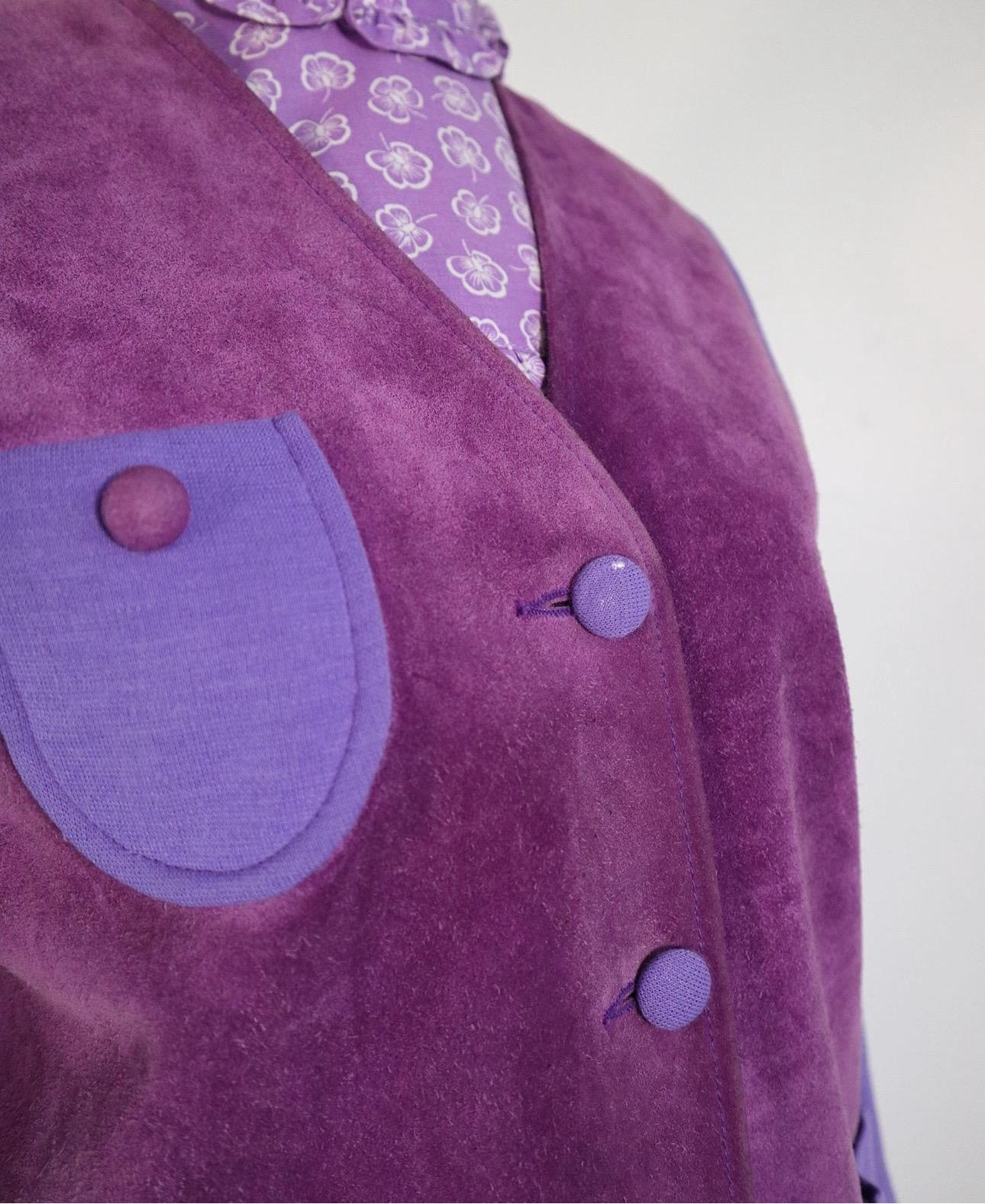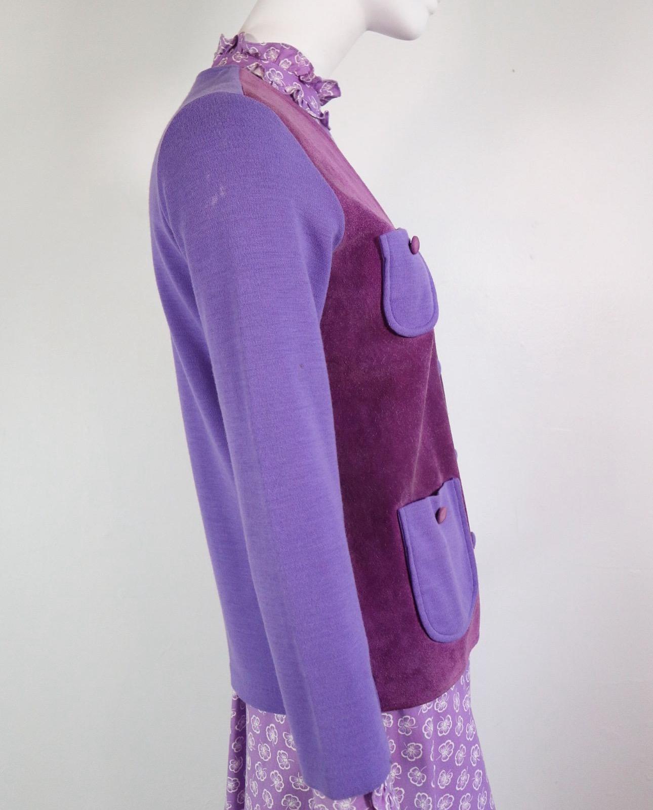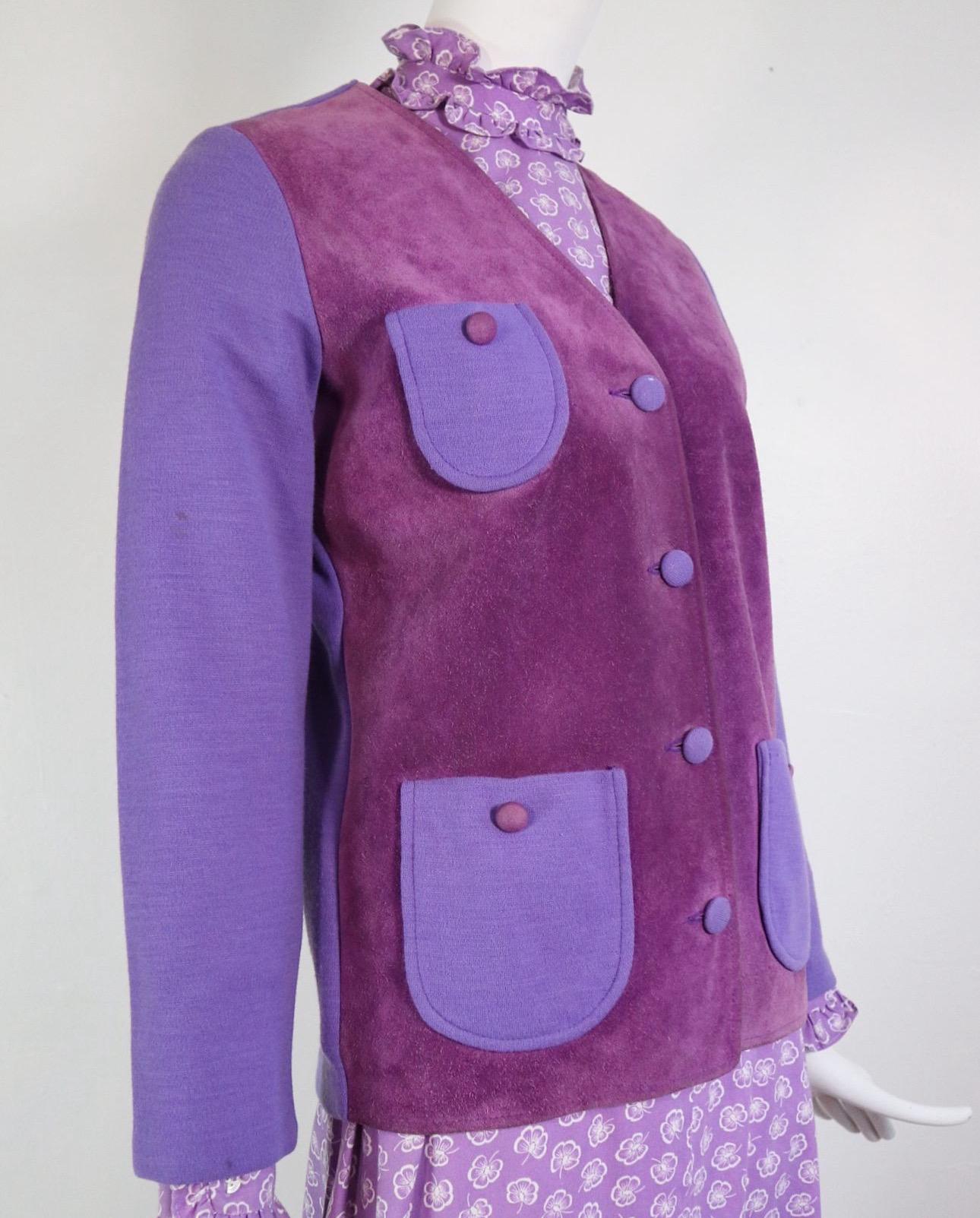💜60's/70's Jantzen suede and wool cardigan with breast and hip pockets, fabric covered button down closure and wonderful floral lining!