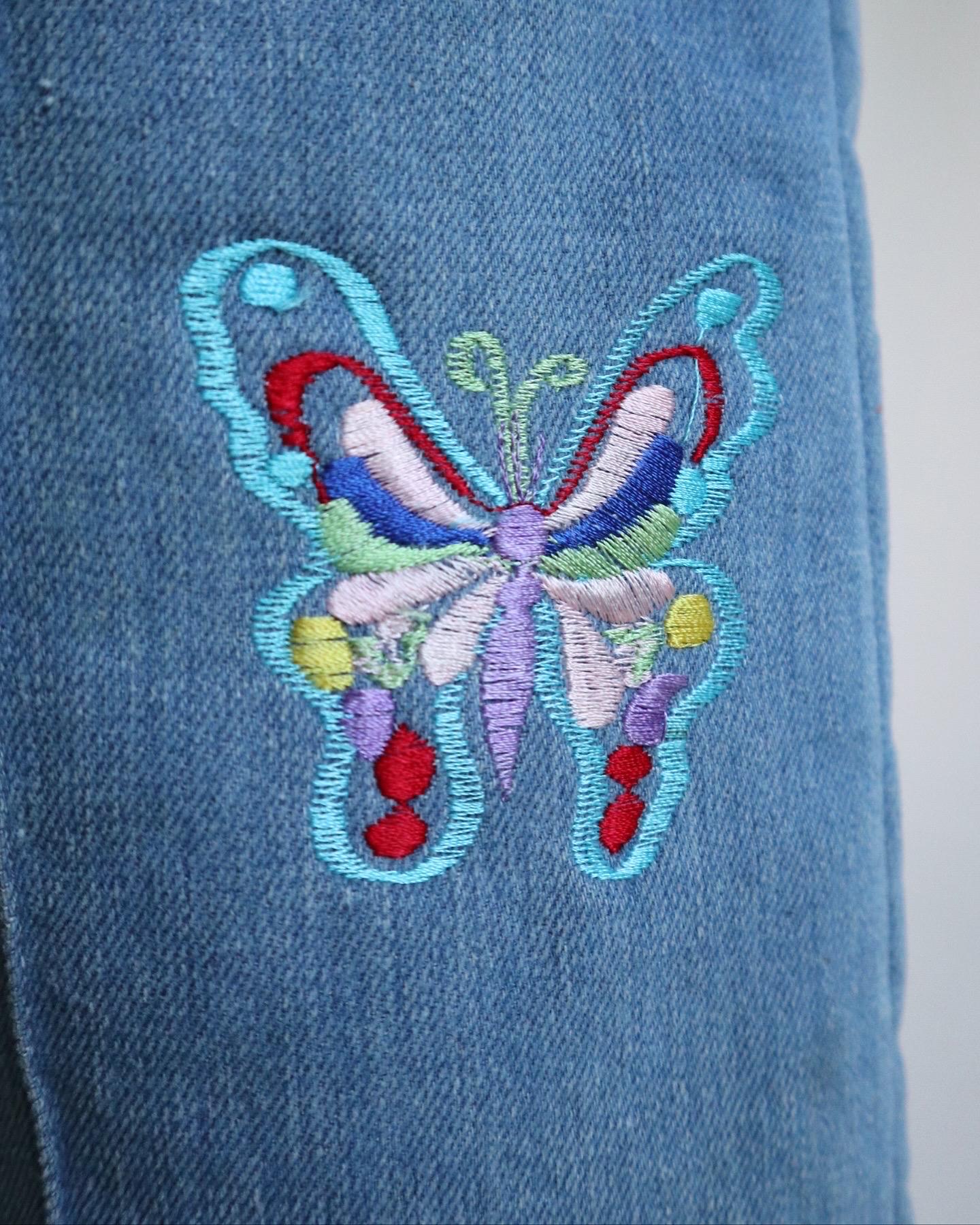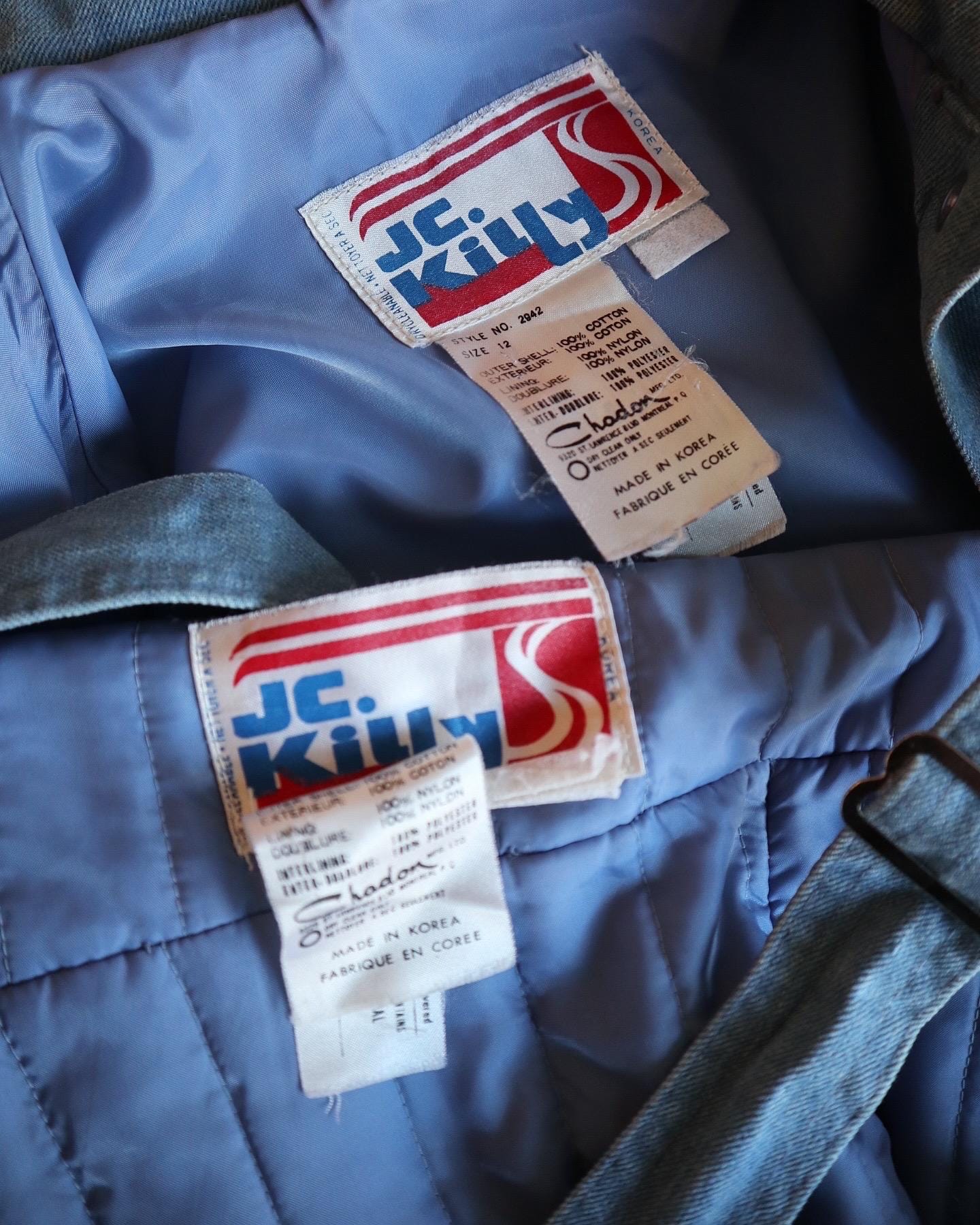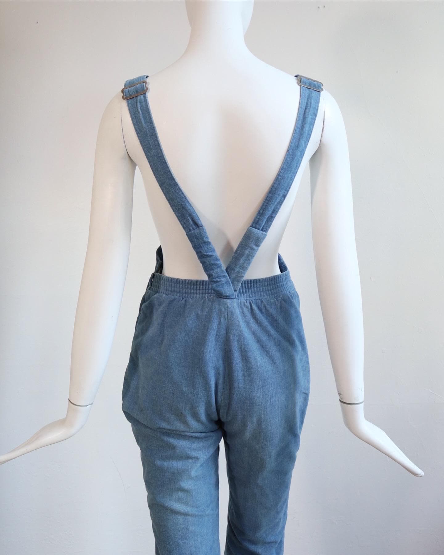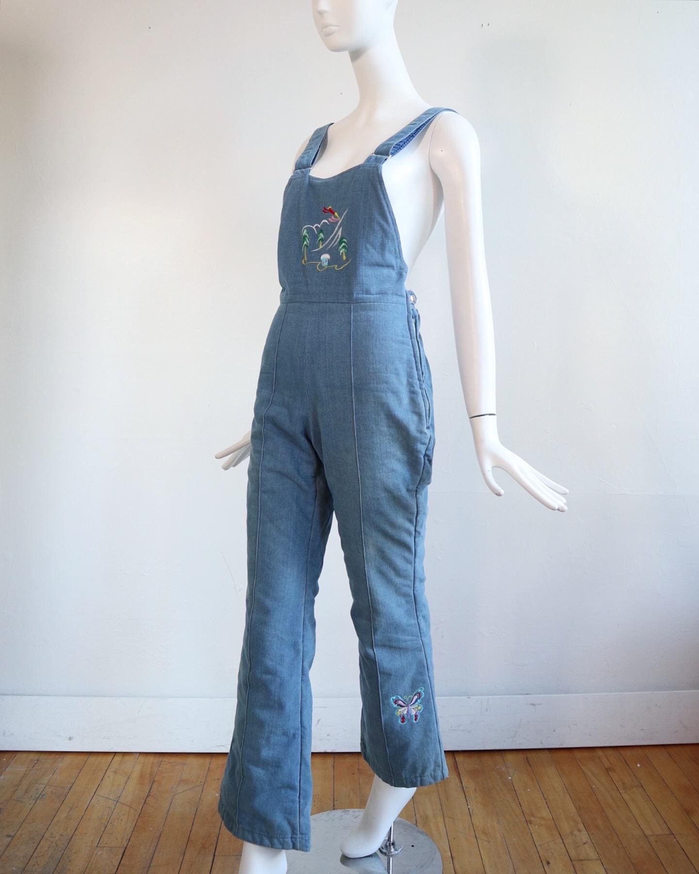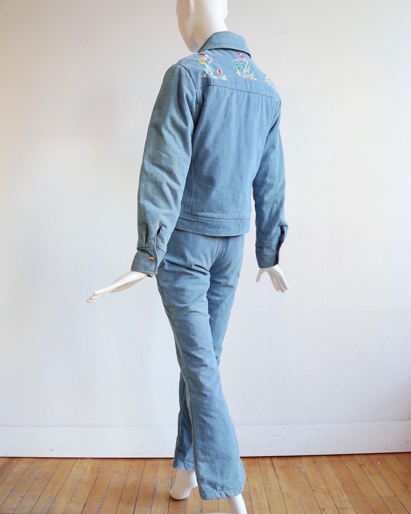 ⛷️You didn't know you needed a 1970's chambray denim snowsuit, did you? Classic styling with a snap front jacket, flared leg overalls and machine embroidery throughout.