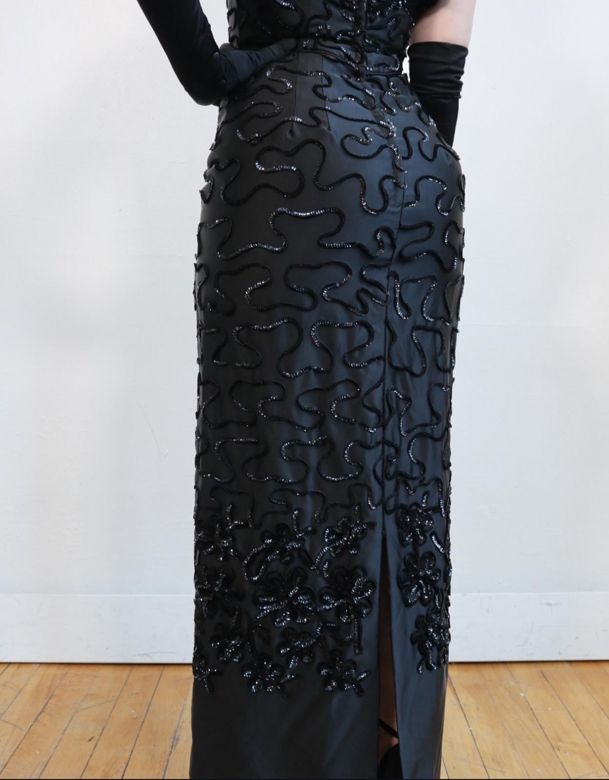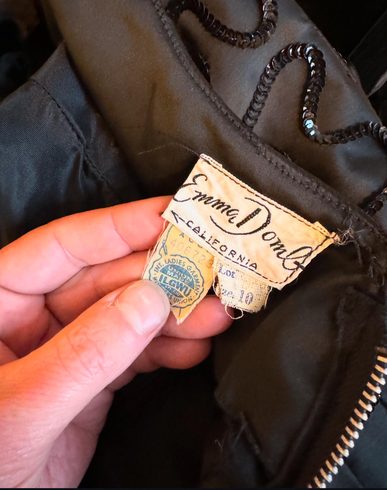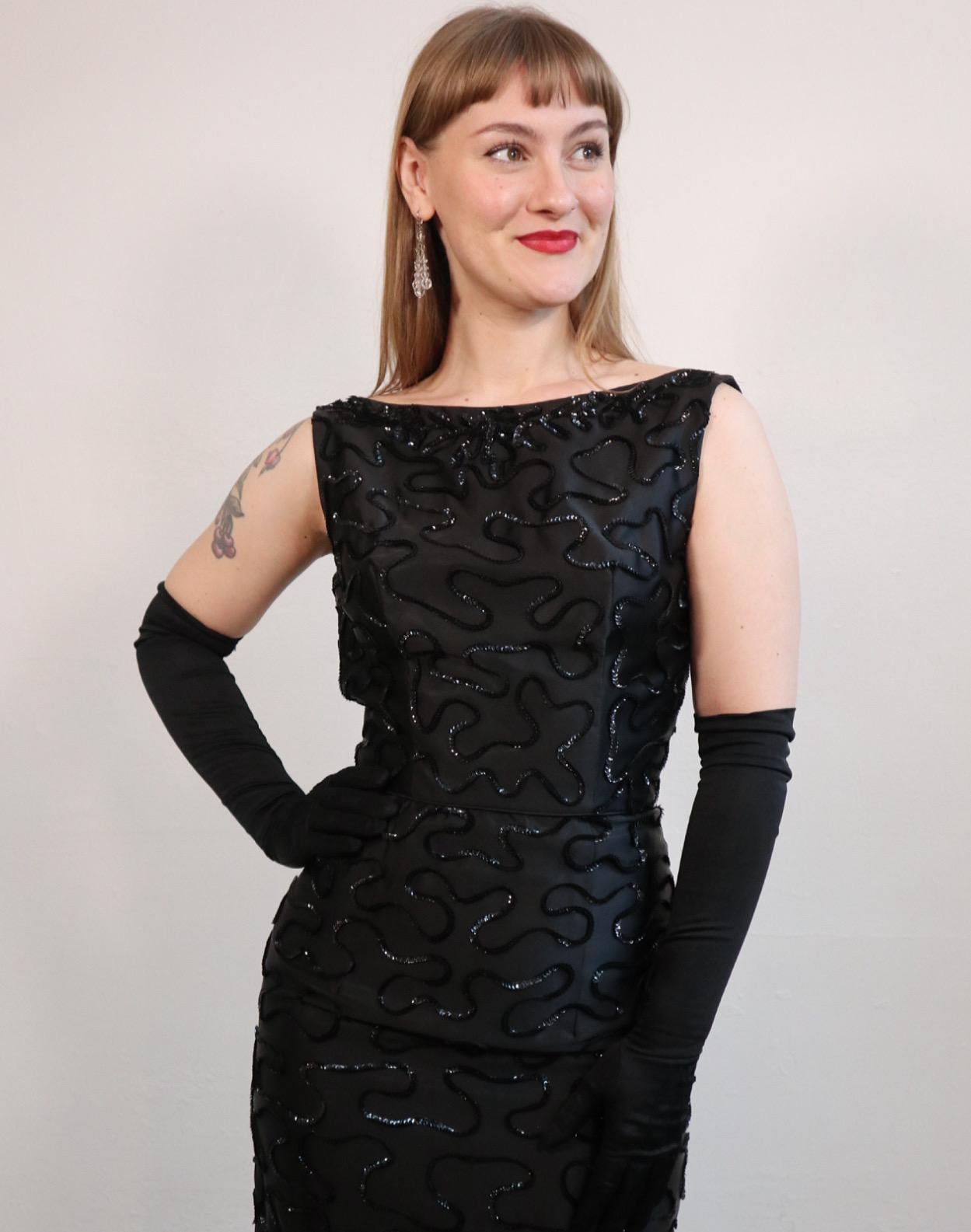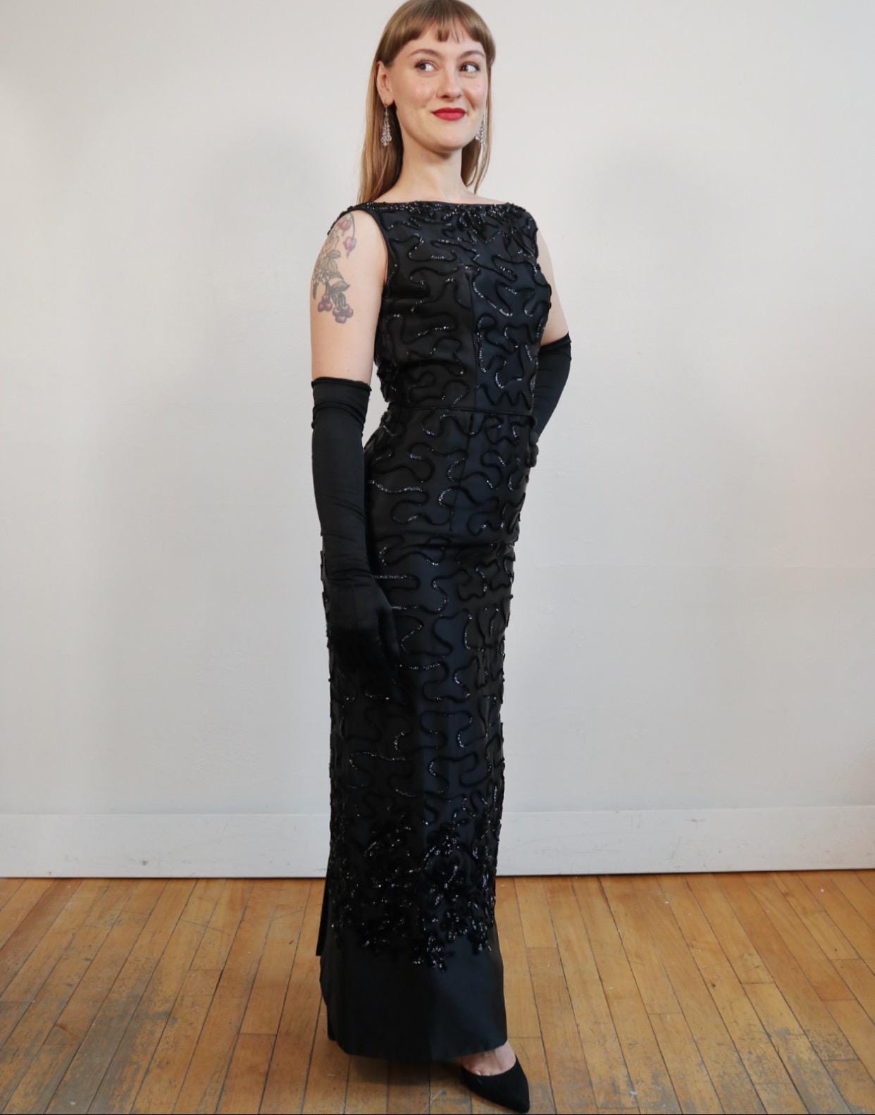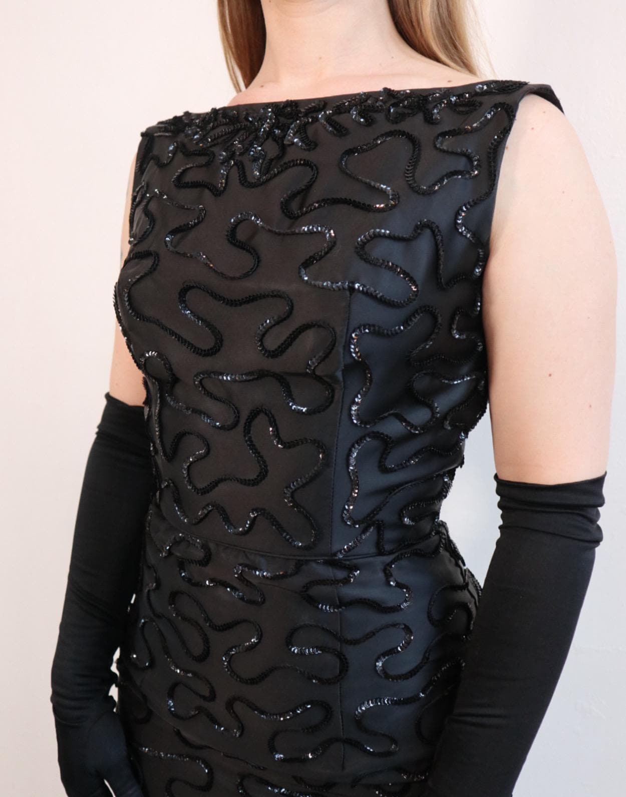 💣Jacee wears a stunning early 1960's sequinned satin bombshell evening dress by Emma Domb! This ravishing beauty is decorated with shimmering sequin squiggles which transform to a floral design bordering the the hemline and features a flattering Sabrina neckline with sexy low back.