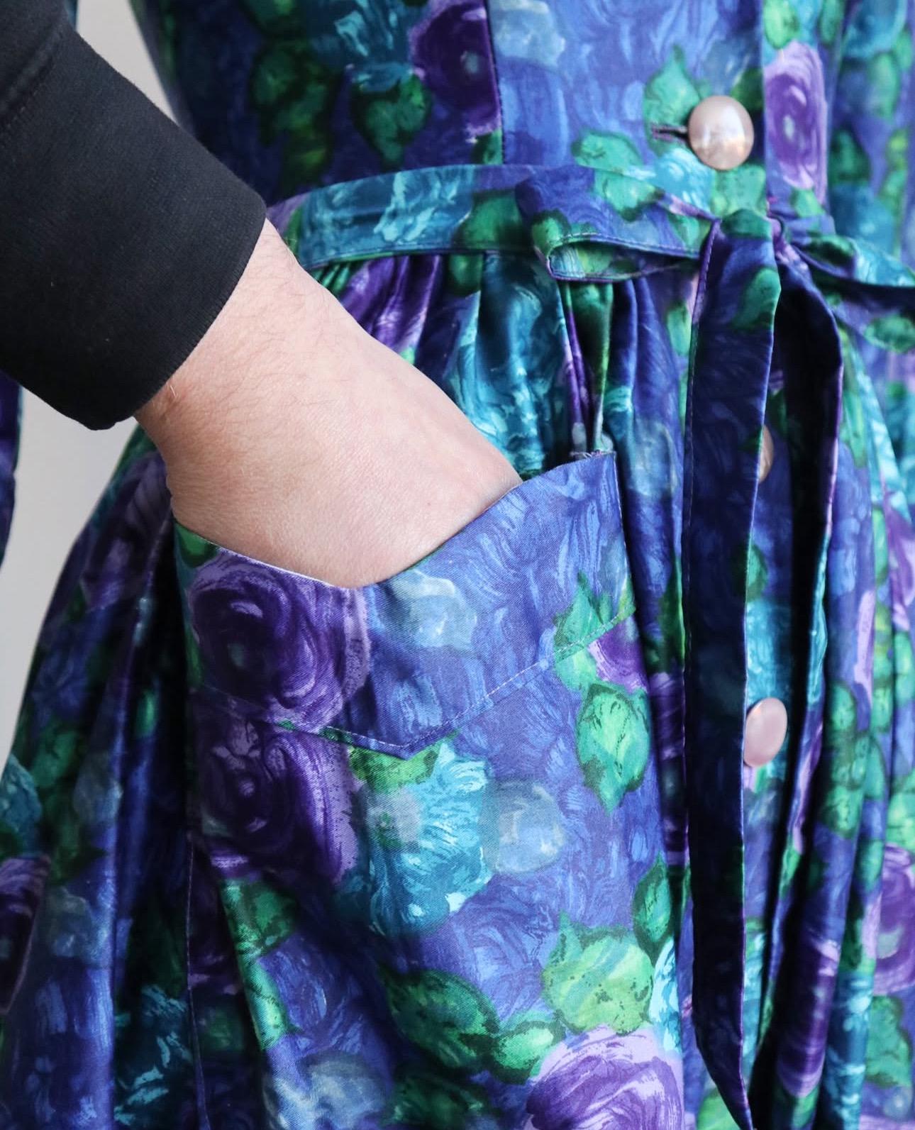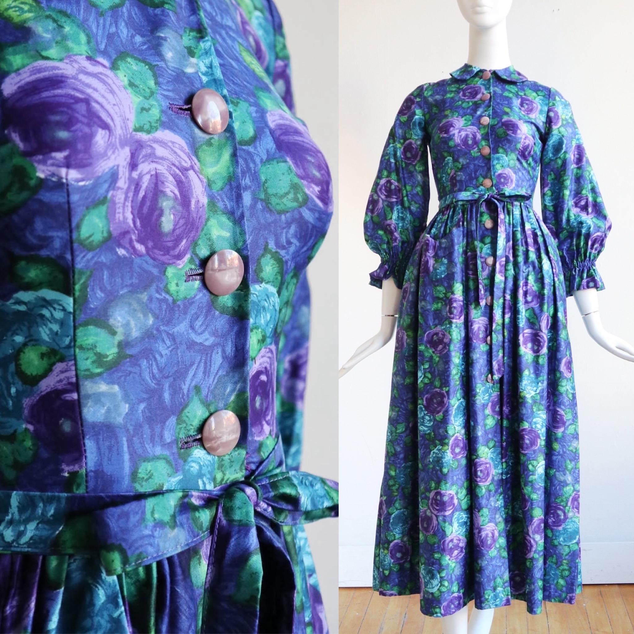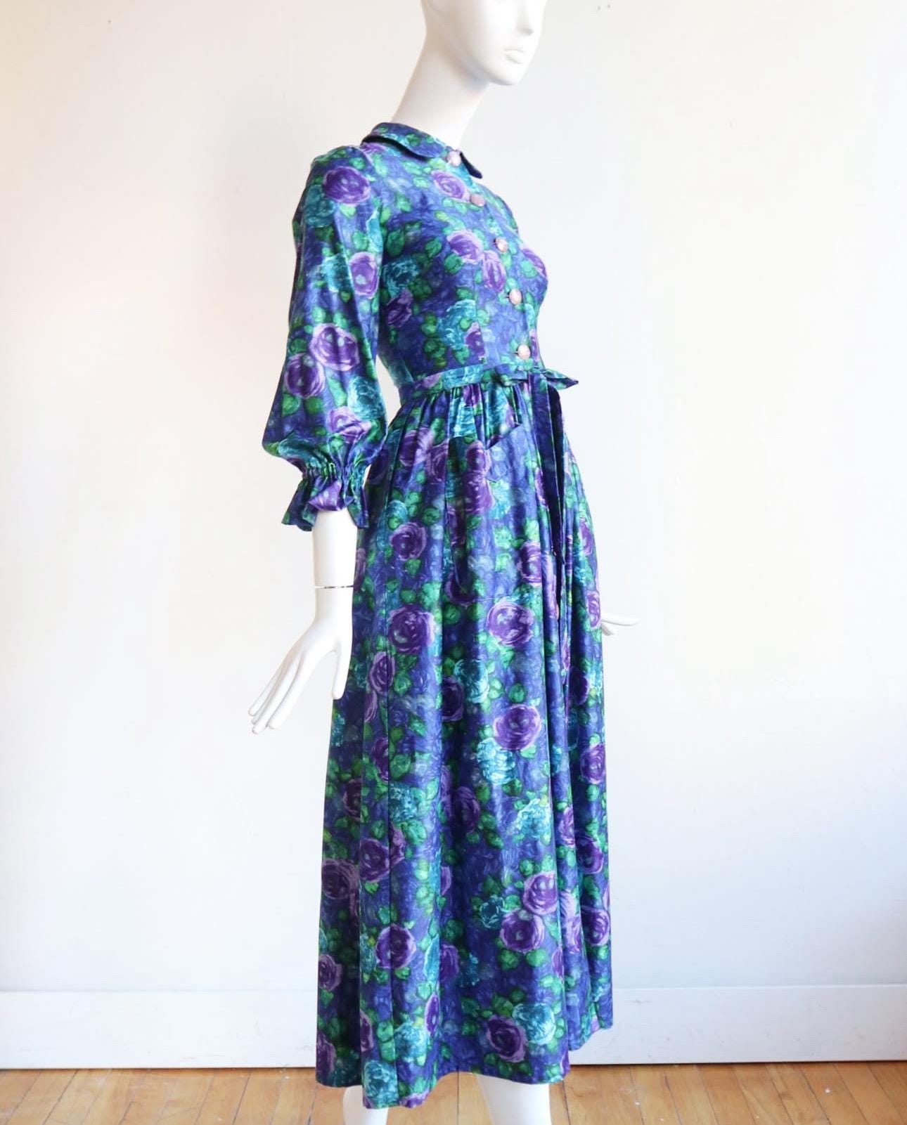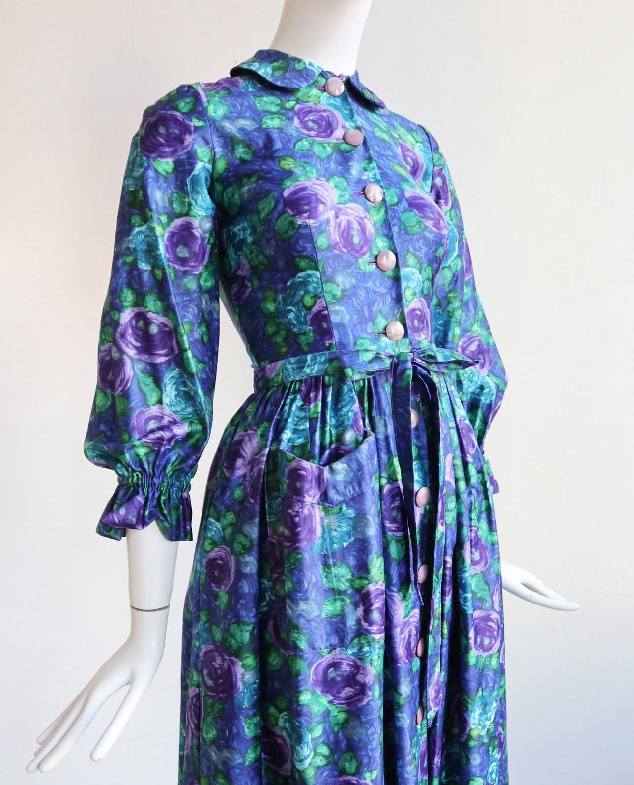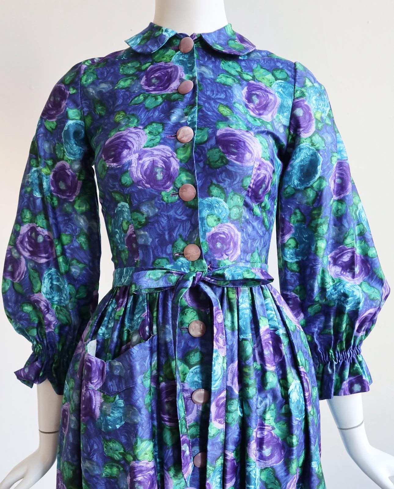 Brilliant late 1950's hostess dress constructed with a rich jewel tone floral brushed cotton. Featuring a pan collar, bishop sleeves, fitted bodice with front button down closure, attached belt, and a full skirt with single hip pocket.