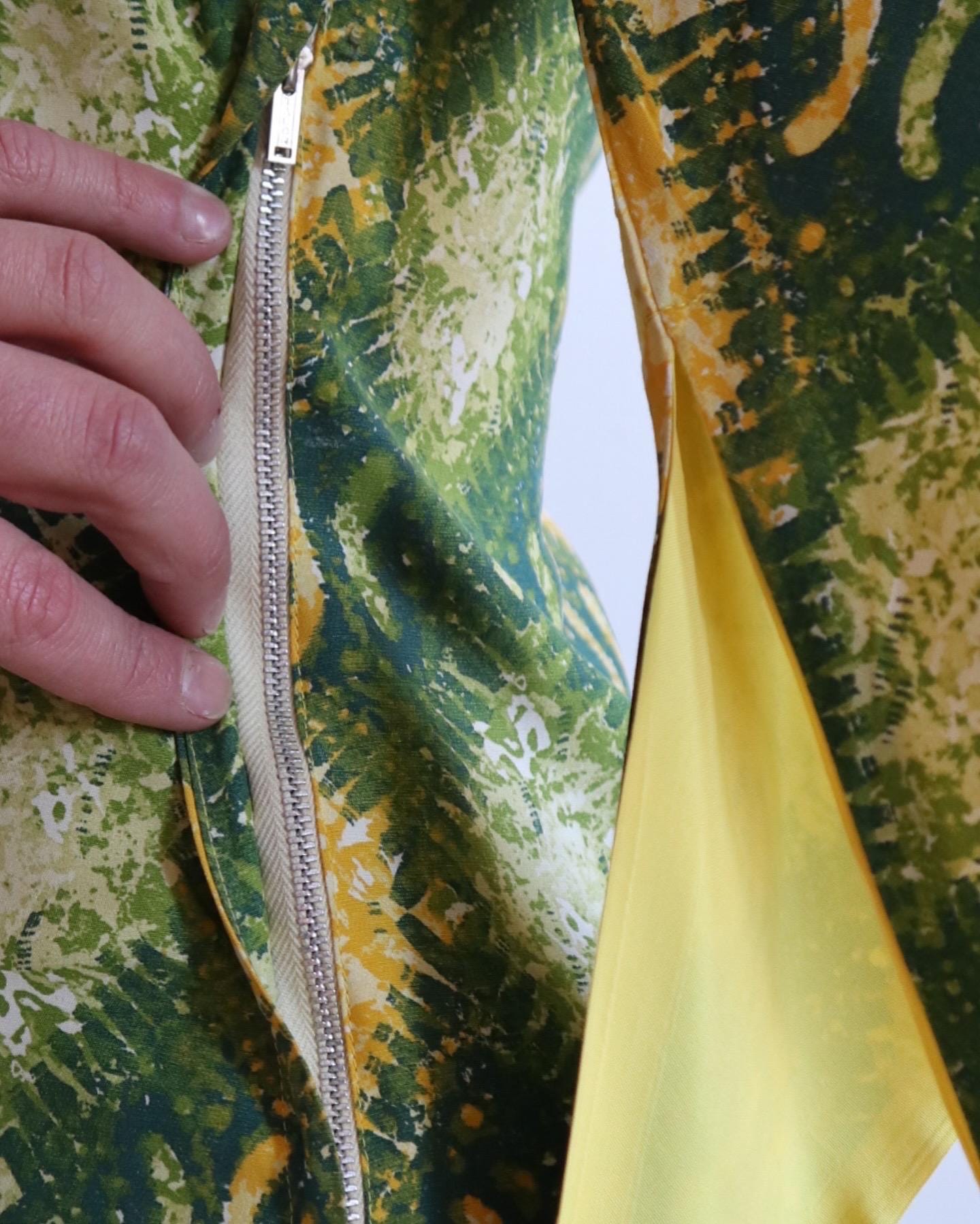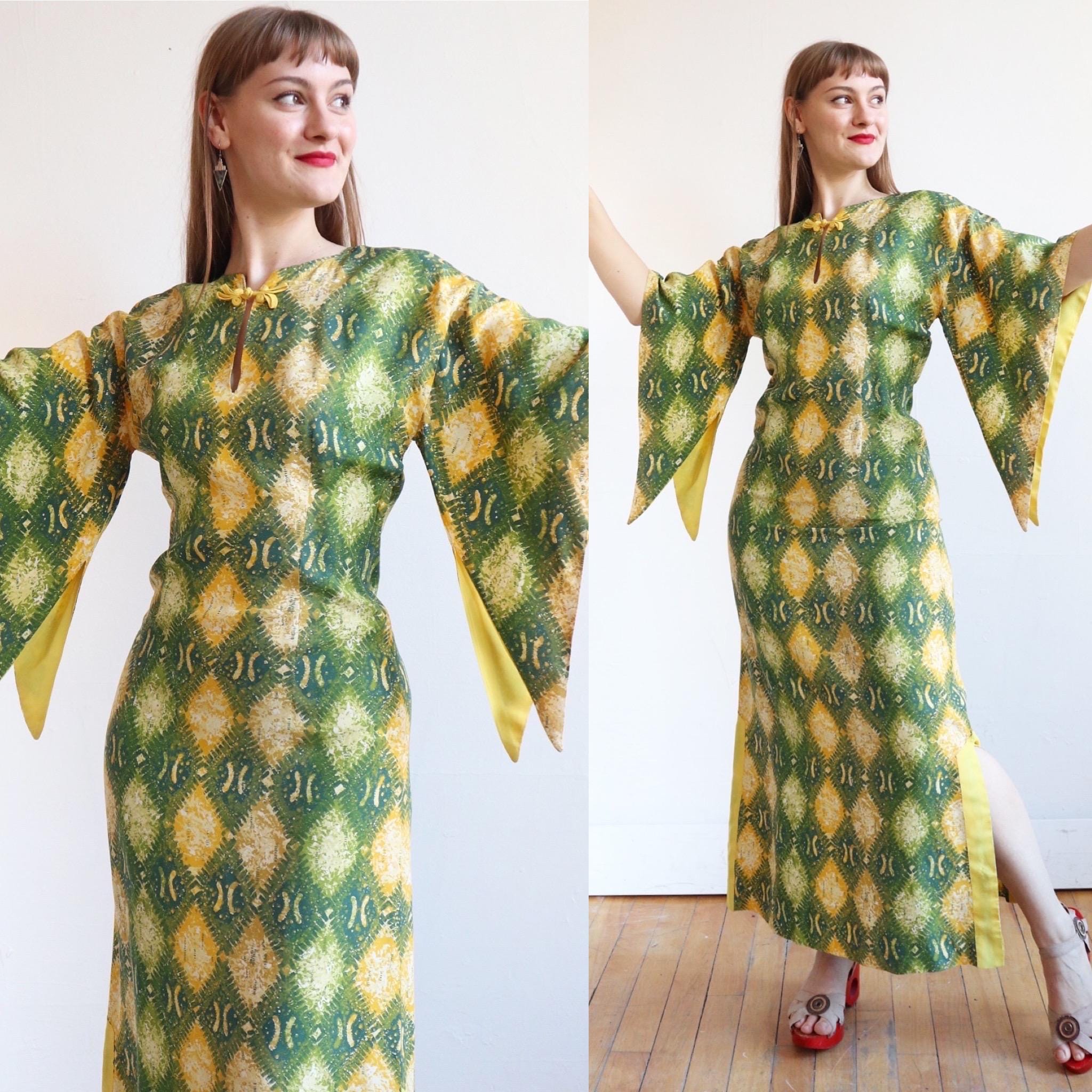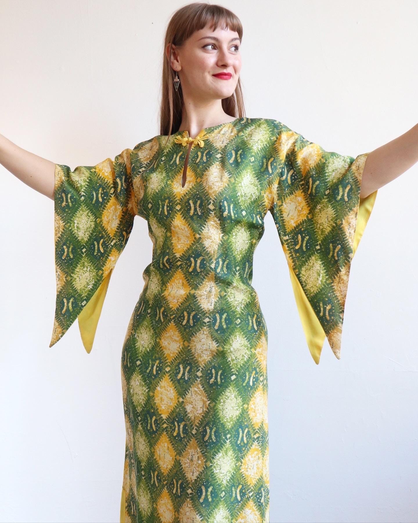 This bold yet chic dress is constructed of silky and lightweight cold rayon in dreamy yellow and green harlequin print with frog closure and irresistible sleeves! The bodice is tailored with princess seaming both front and back for the perfect fit.