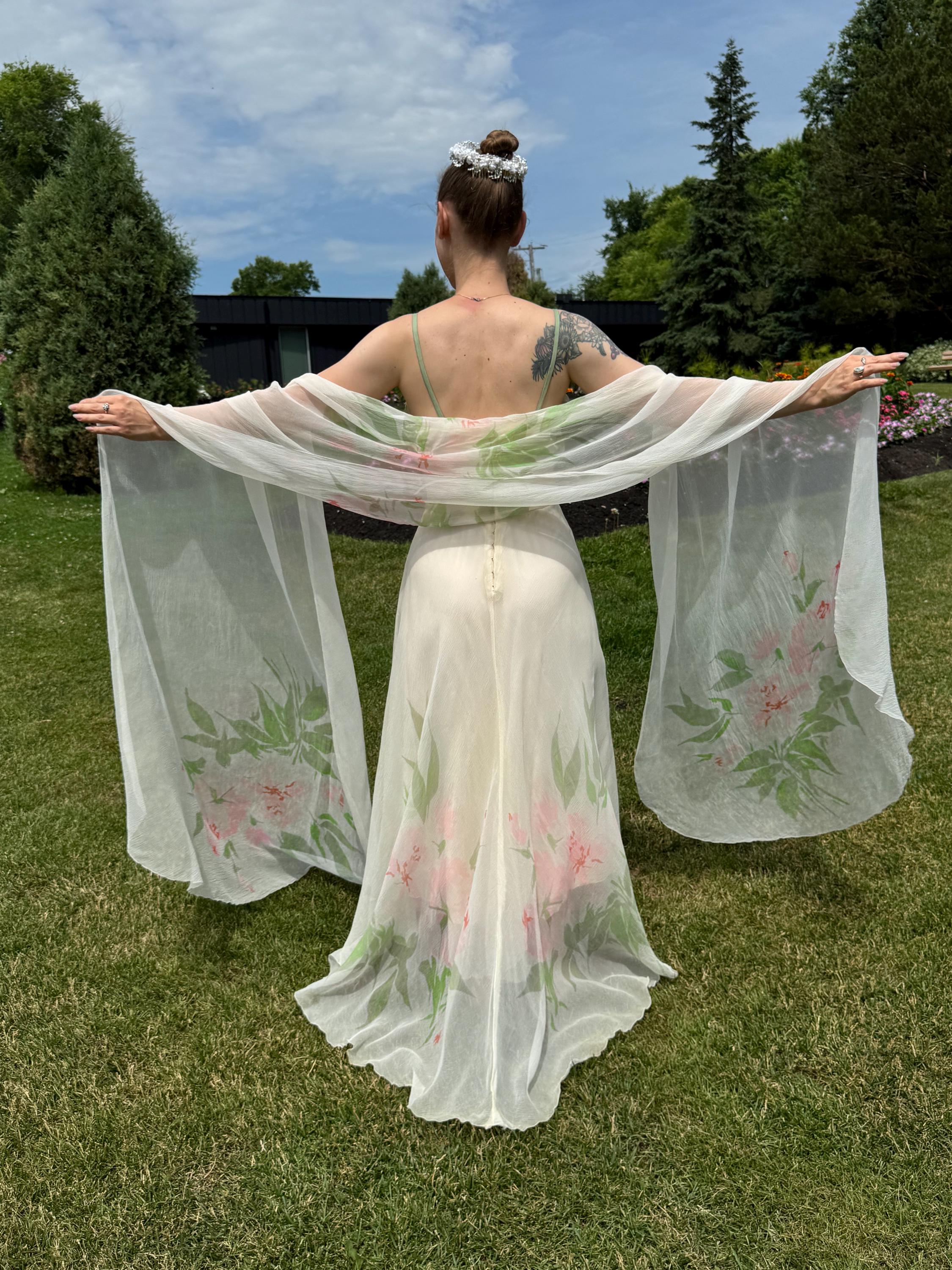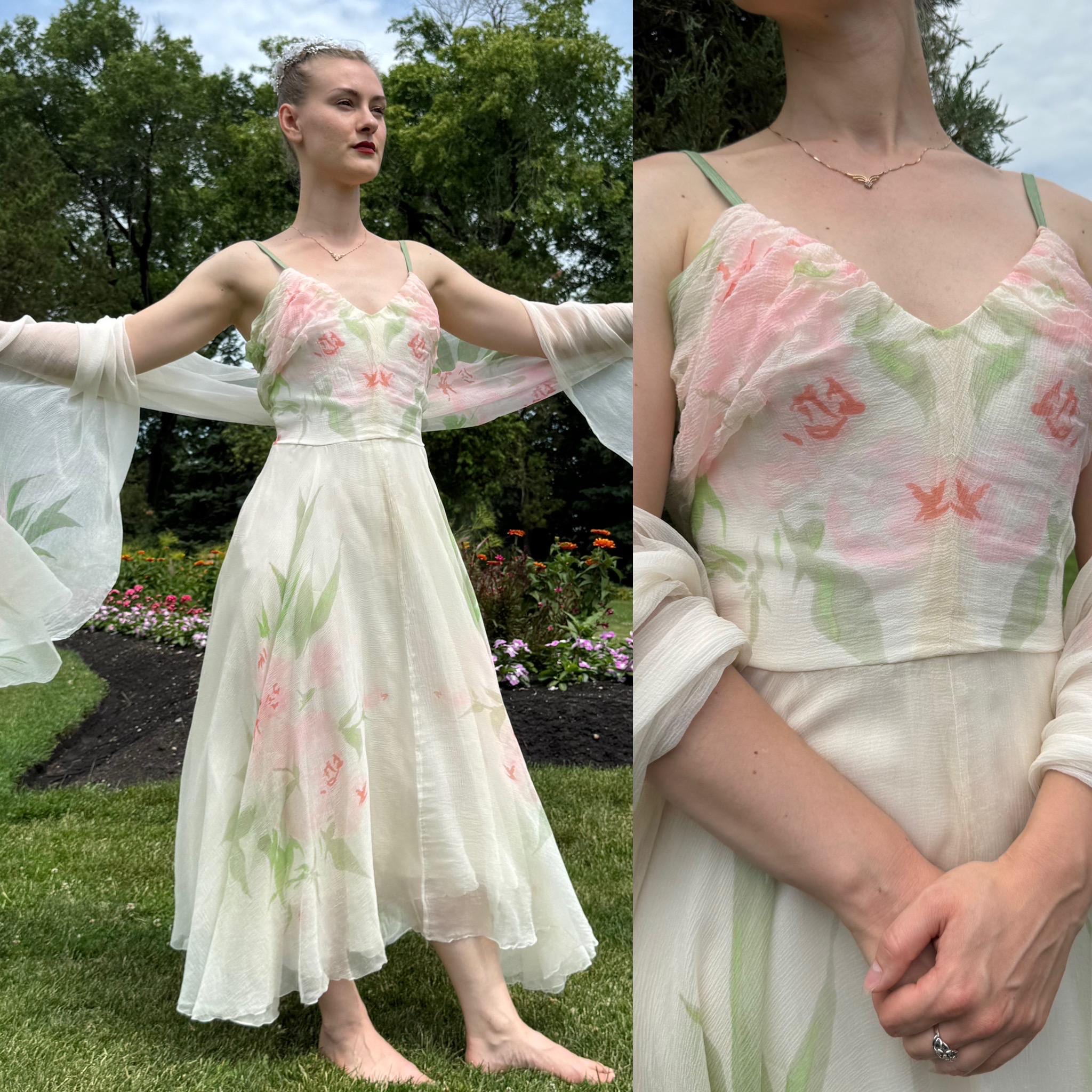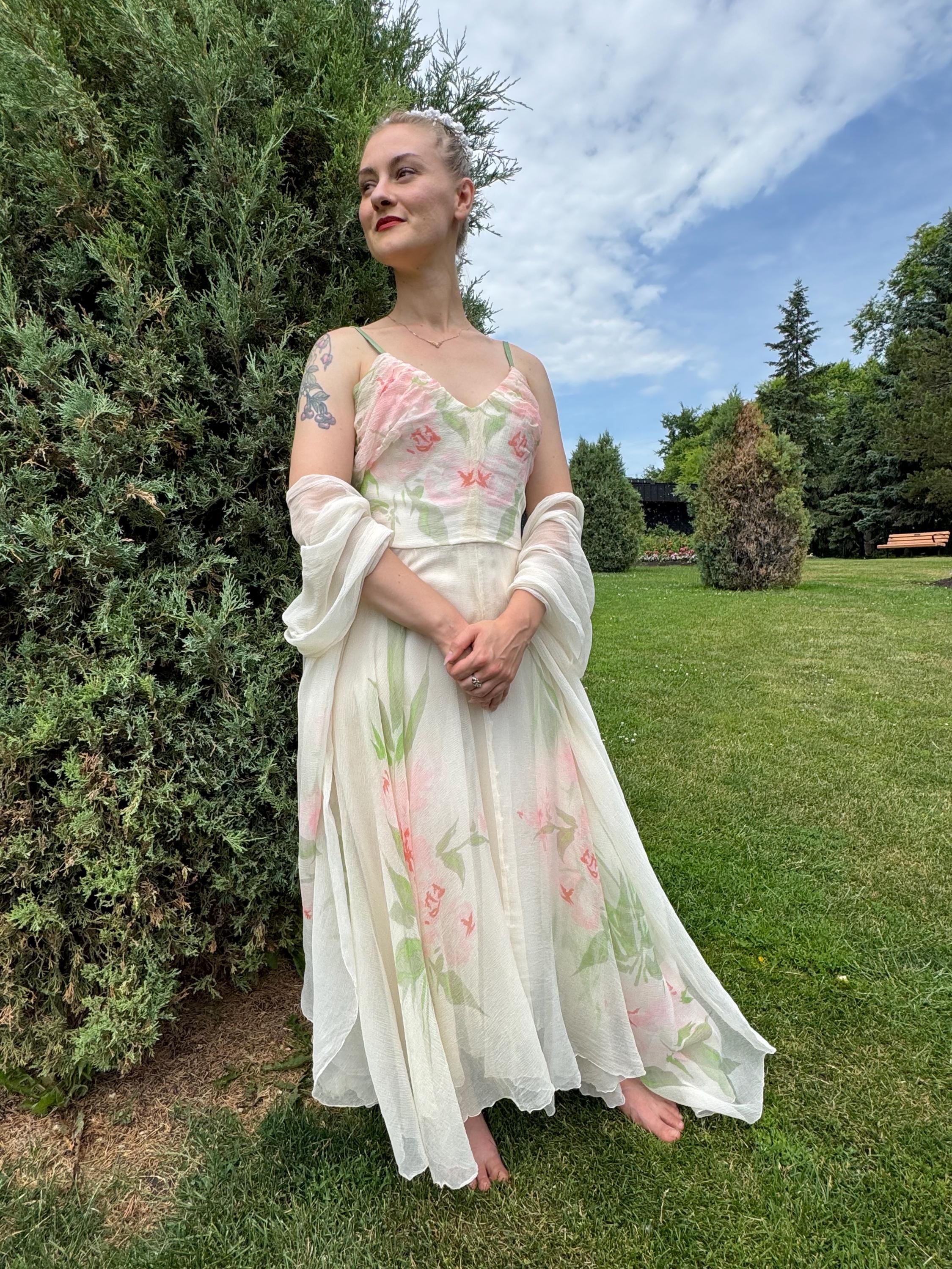 Rare and Exquisite 1950's Irene Lentz couture floral silk chiffon dress and shawl set. The perfect bridal piece! This breathtaking beauty is constructed with frothy layers of silk chiffon with a beautiful floral print. Thin silk shoulder straps, gathered sweetheart neckline and a massive skirt which is shorter in front and longer in back.