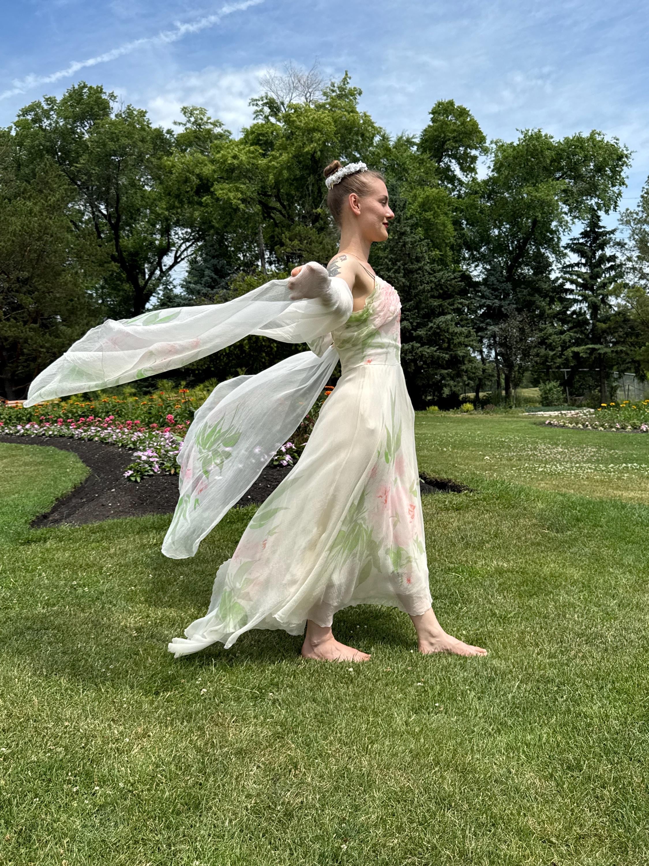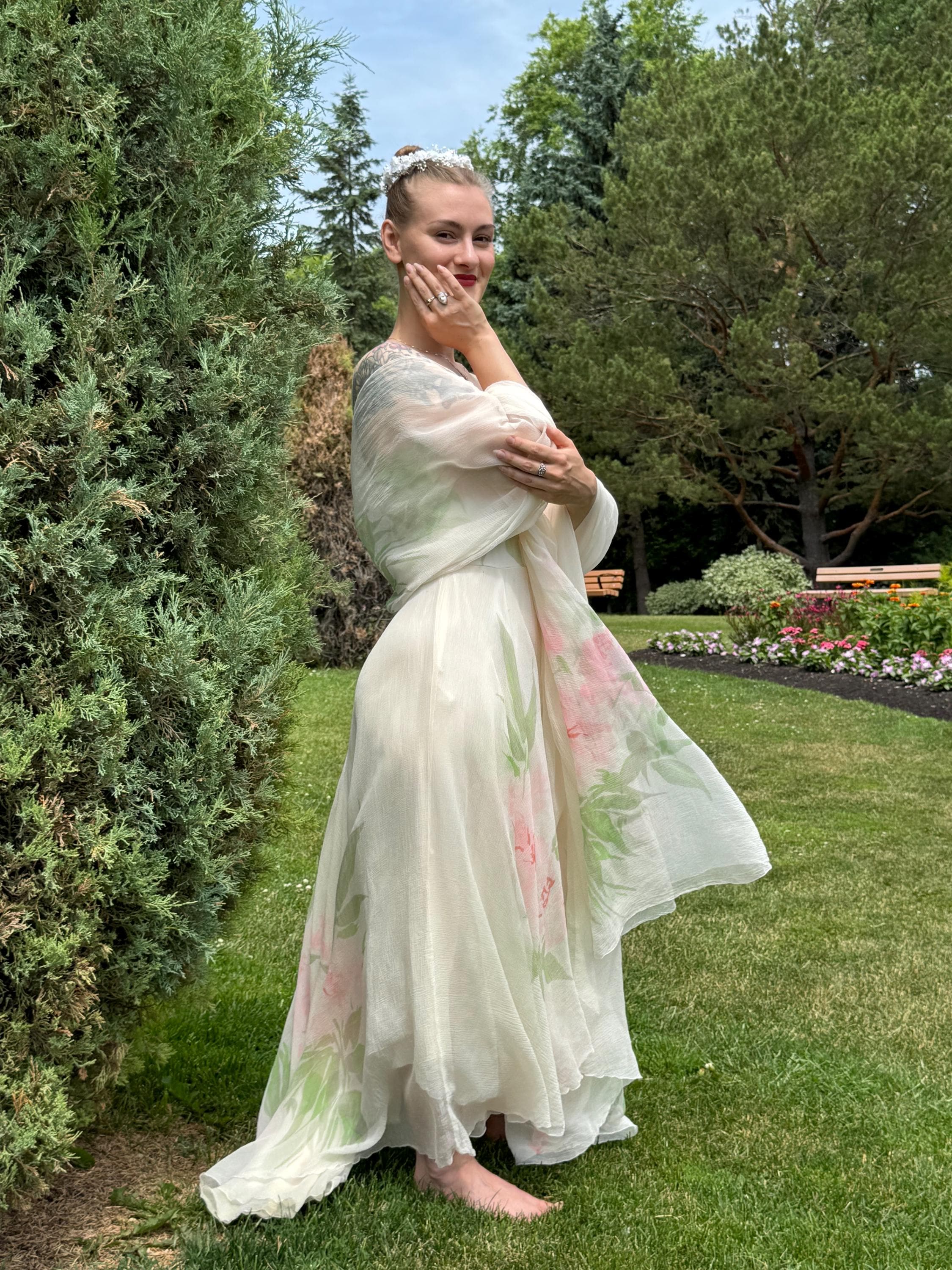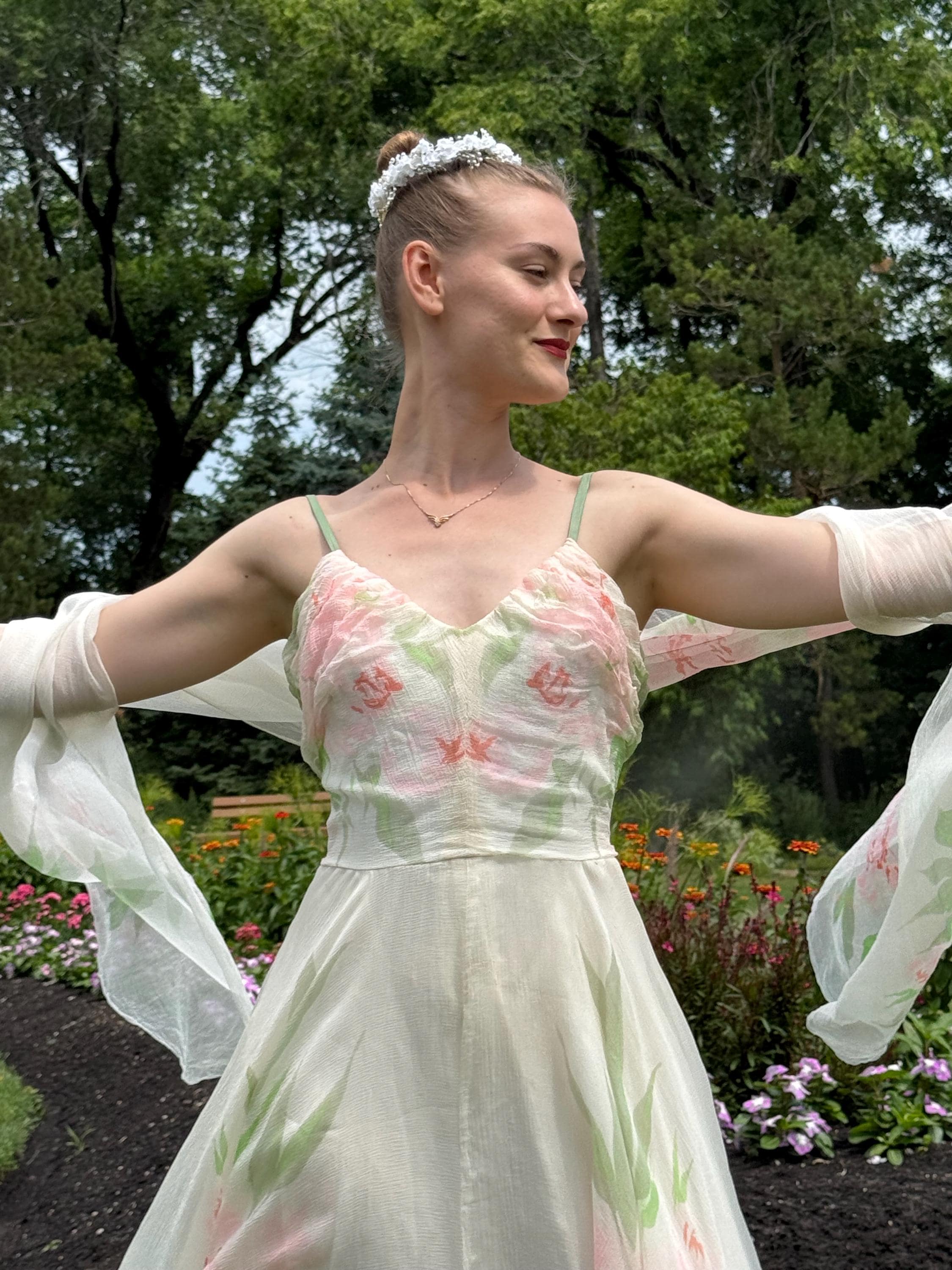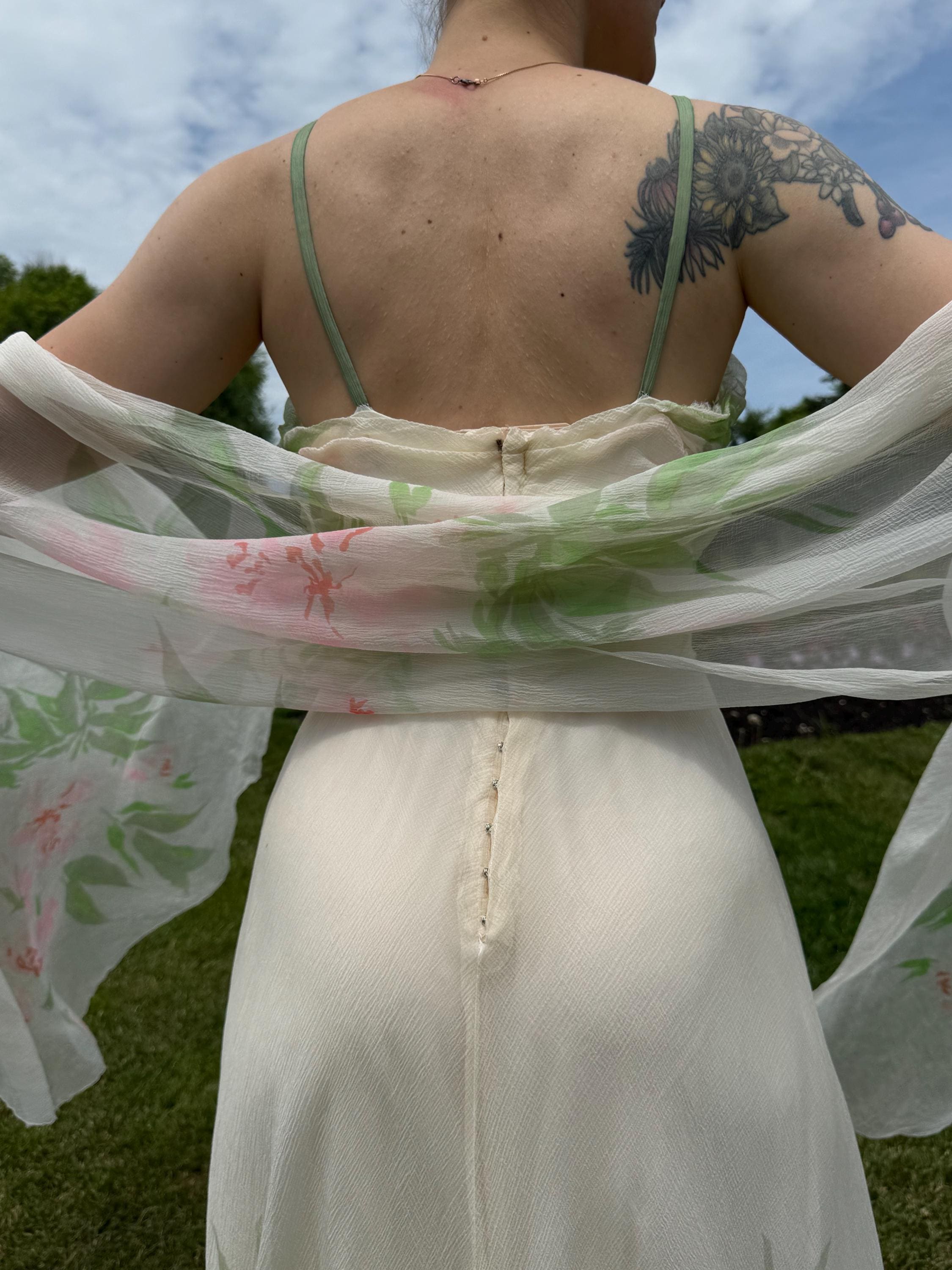 Rare and Exquisite 1950's Irene Lentz couture floral silk chiffon dress and shawl set. The perfect bridal piece! This breathtaking beauty is constructed with frothy layers of silk chiffon with a beautiful floral print. Thin silk shoulder straps, gathered sweetheart neckline and a massive skirt which is shorter in front and longer in back.