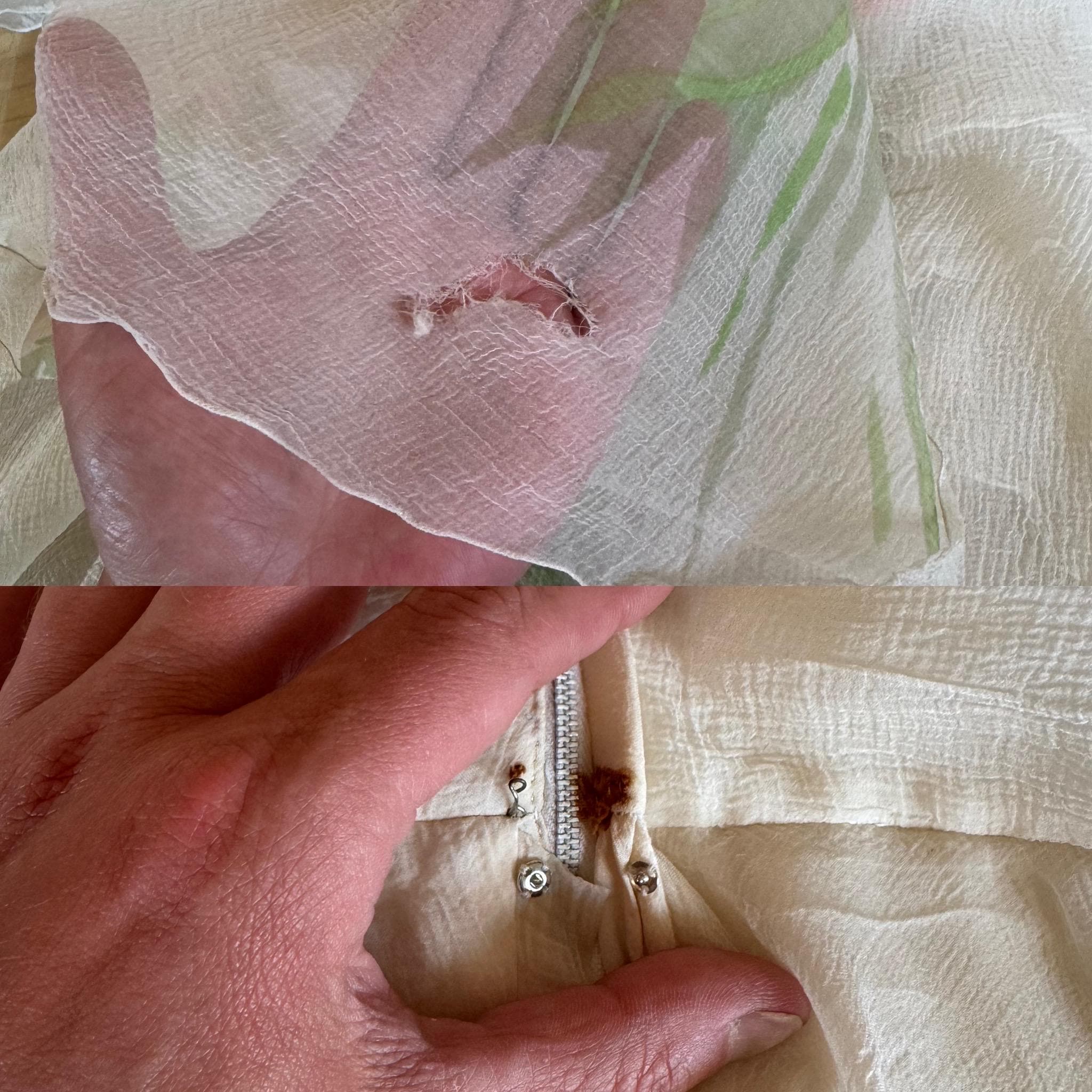 Excellent coverall condition with a small rust spot on back zipper which is hidden beneath the placket and an L shaped tear near the back hem. Can be mended/well hidden within the fabric.